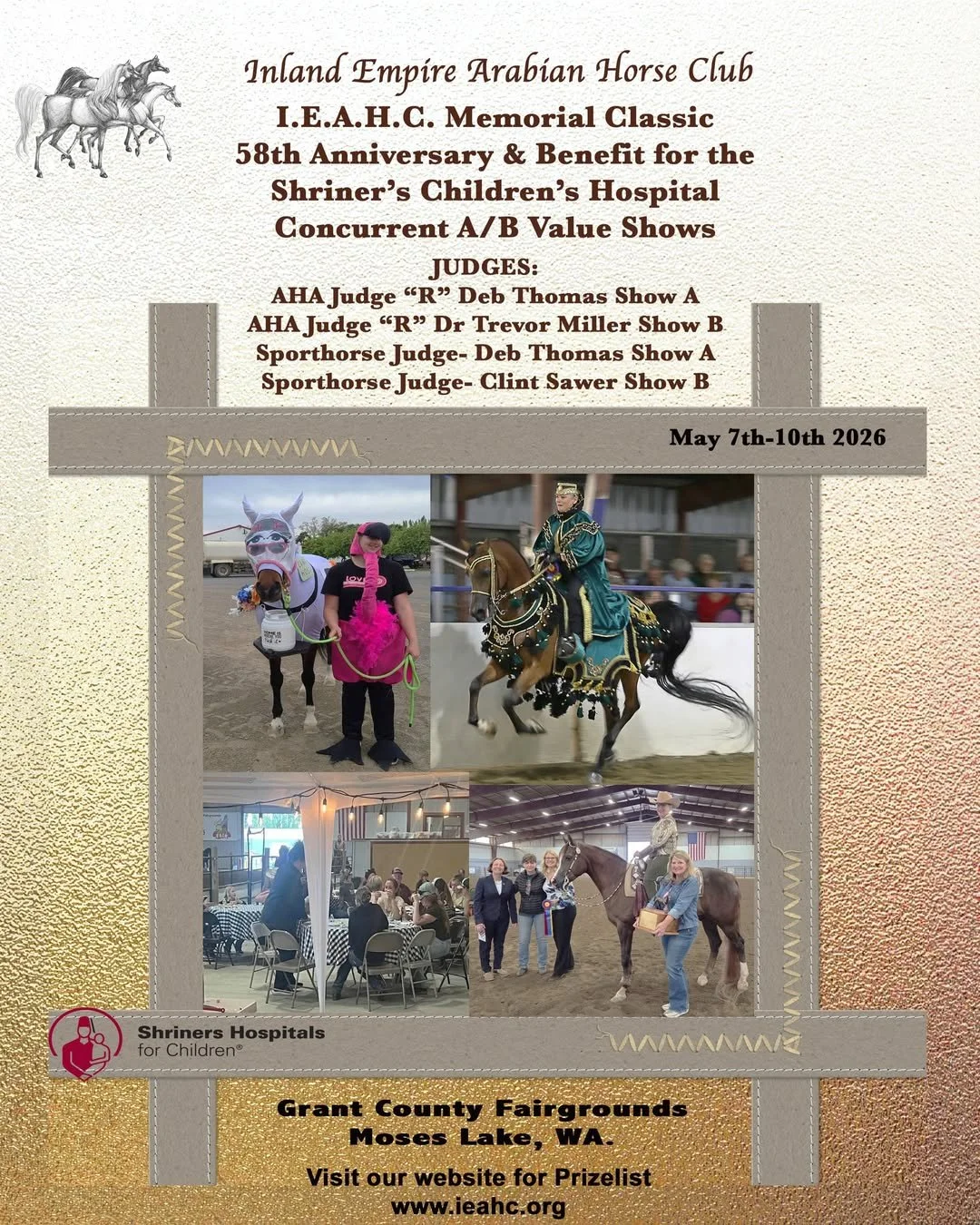 IEAHC Memorial Classic (Grant County Fairgrounds) Thursday, May 7, 2026 1:30 AM 01:30 Sunday, May 10, 2026 2:30 AM 02:30 Inland Empire Arabian Horse Club 8716 W. RUTTER PKWY SPOKANE United States (map) Google Calendar ICS